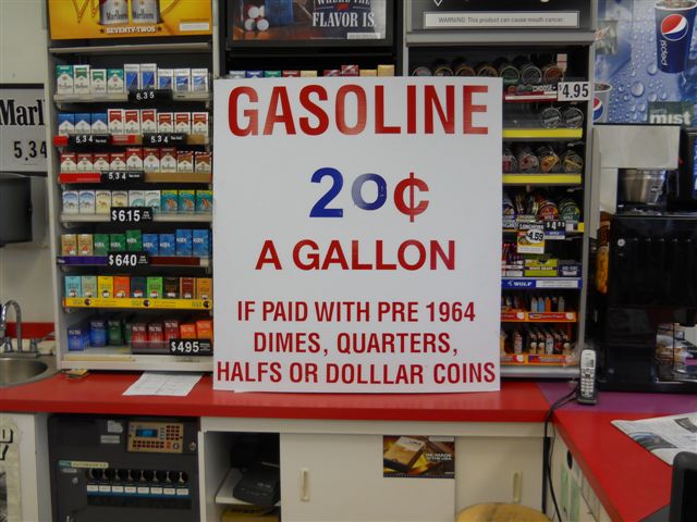 A throwback to a long-gone era, when 20 cents would buy you a gallon of gasoline, pumped for you by a local kid, who would check your tire pressure and wash your windshield too. Now thanks to a debased US dollar and minimum wage laws, you have to pump your own damn gas, and pay near $5 a gallon to do it. Well some enterprising gas station owner is now selling his gas for the shockingly “low” price of only 20 cents a gallon. Of course, he only accepts silver coins from pre-1964. At today’s silver prices, this equates to a bit over $5 a gallon in fiat paper money.