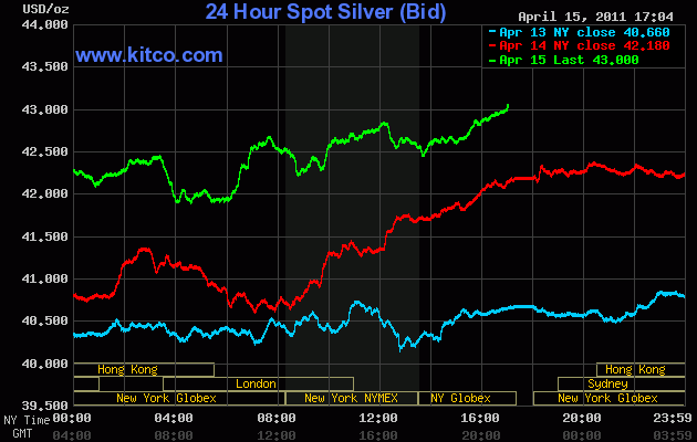 Silver continued its meteoric rise upward today, breaking the $43 level. Fed policymakers are in disagreement on how best to tackle accelerating inflation as news came of a 0.5% increase in the Consumer Price Index, which extrapolates out to a 6% annual inflation increase. The CPI is the Fed’s cooked up inflation number which disregards price increases in food and energy where average Americans are getting hit the hardest (bought any gasoline lately?). The rising prices of silver and gold only underscore the massive inflation that Bernanke’s policies are causing.