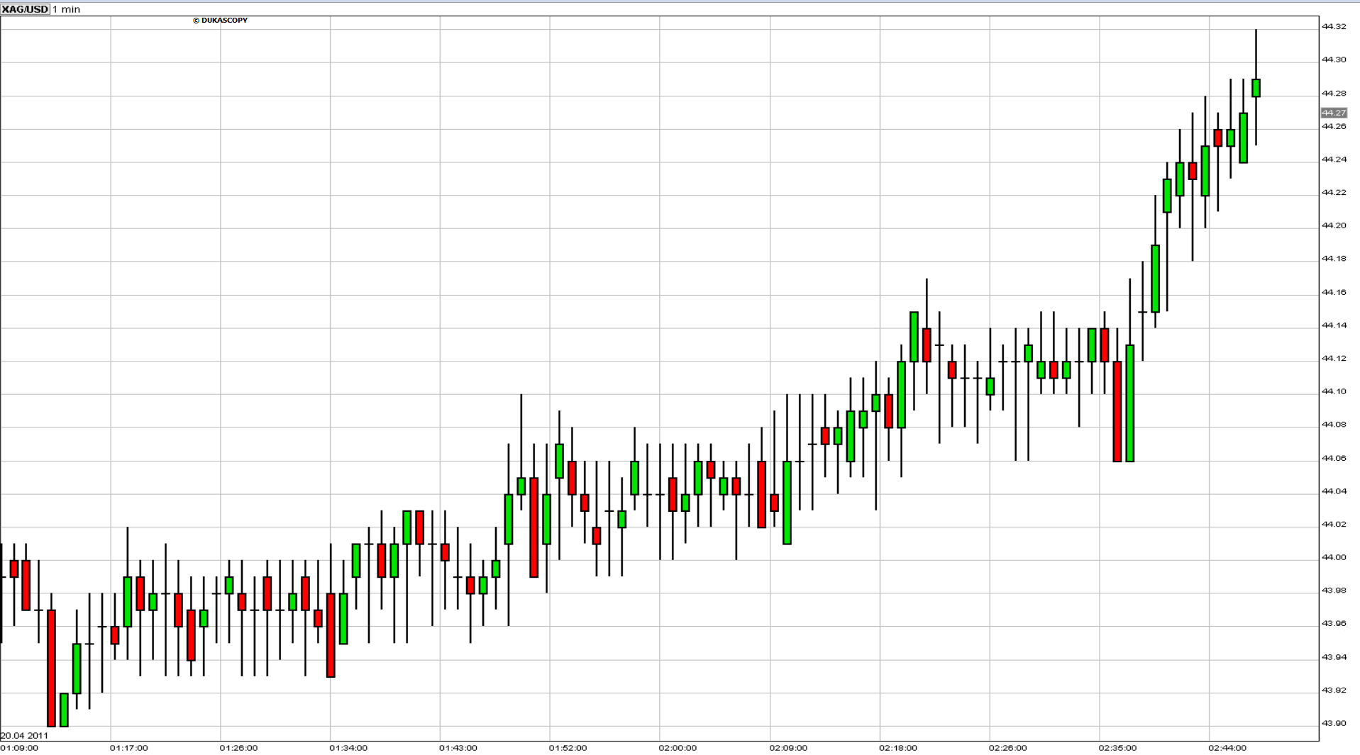 Silver has moved decisively through the $44 mark, a day after the S&P downgraded the US debt rating. Investors are still turning to gold, and particularly silver, as a safe hedge against Bernanke-flation. Gold broke the $1500 mark, setting new all-time highs, but silver continues to outperform gold in this incredible bull market. Silver is currently trading at $44.30.