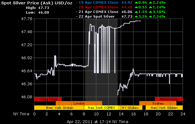 Most of the major exchanges are closed for the Easter weekend, but the low trading volume is causing volatile spikes and dips in silver price in the Asian markets. We will have to see if these numbers hold when the big exchanges open Monday morning.